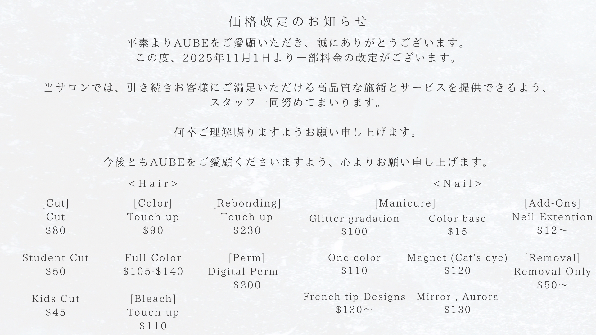 カラーやパーマで使用する薬剤や各種機材は全て、日本から輸入した日本製になりますので、髪や頭皮のダメージを気にすることなく、安心してご利用頂けます。